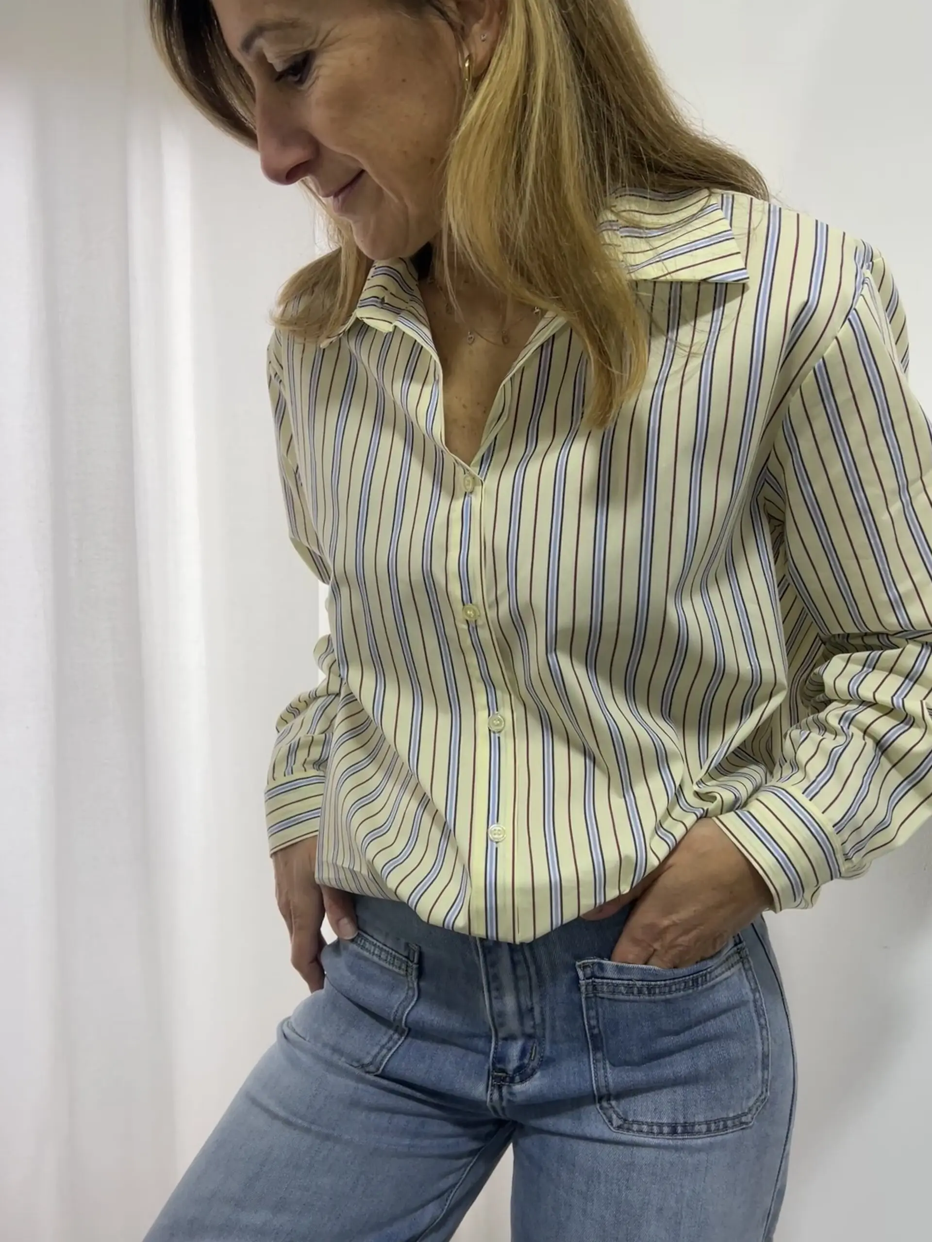 Camisa amarilla de algodón de diseño grande y largo. Estilo traje. Cuello clásico. Manga larga con botones frontales y trabilla en la espalda. Estampada de rayas color marrón y azul.