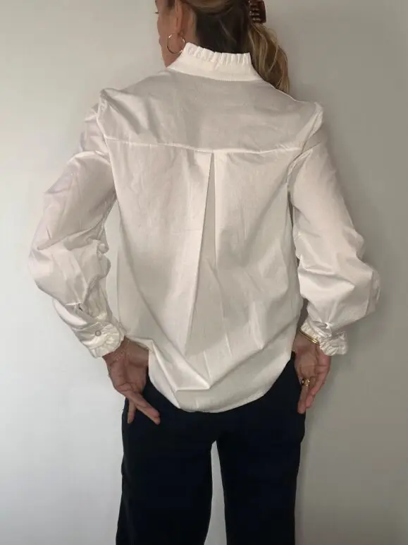 Camisa blanca con botones frontales ocultos, de manga larga, con detalle de volantes en el cuello y en los puños.