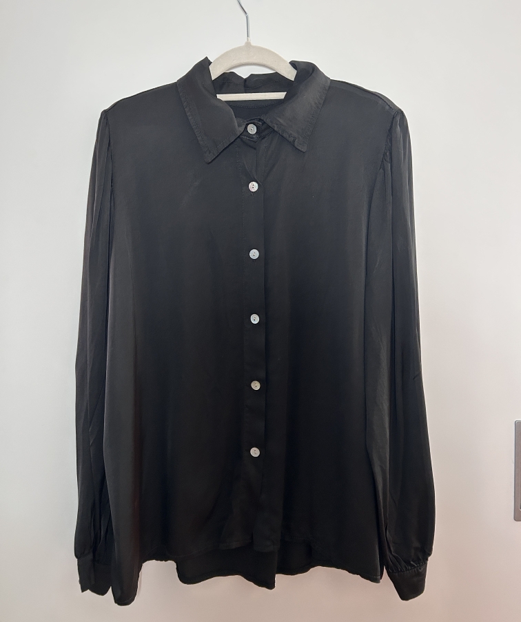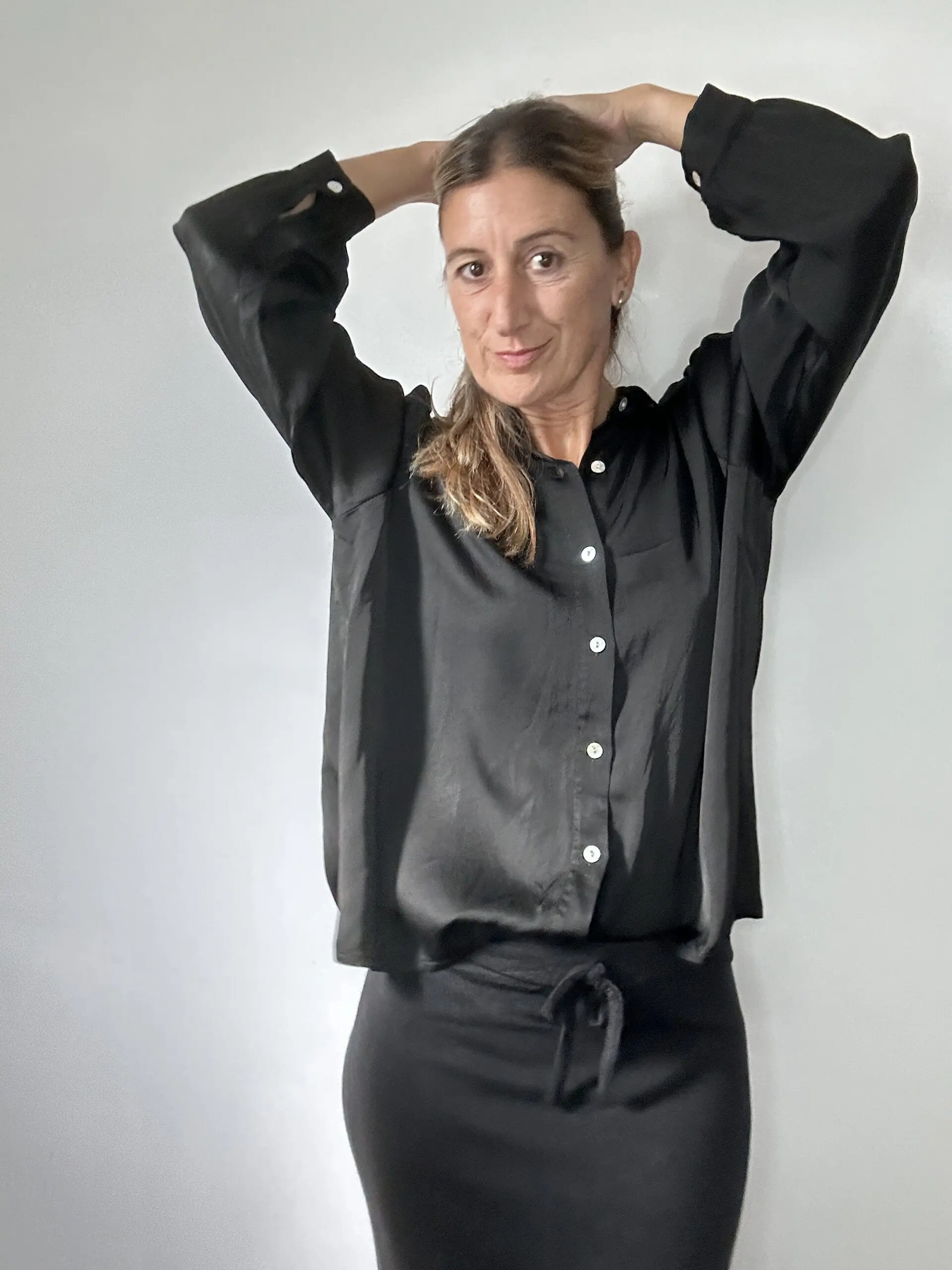 Camisa confeccionada en tejido de viscosa y seda, de diseño recto y cuello camisero. Manga larga con botones frontales de nácar, pliegues en la espalda.
