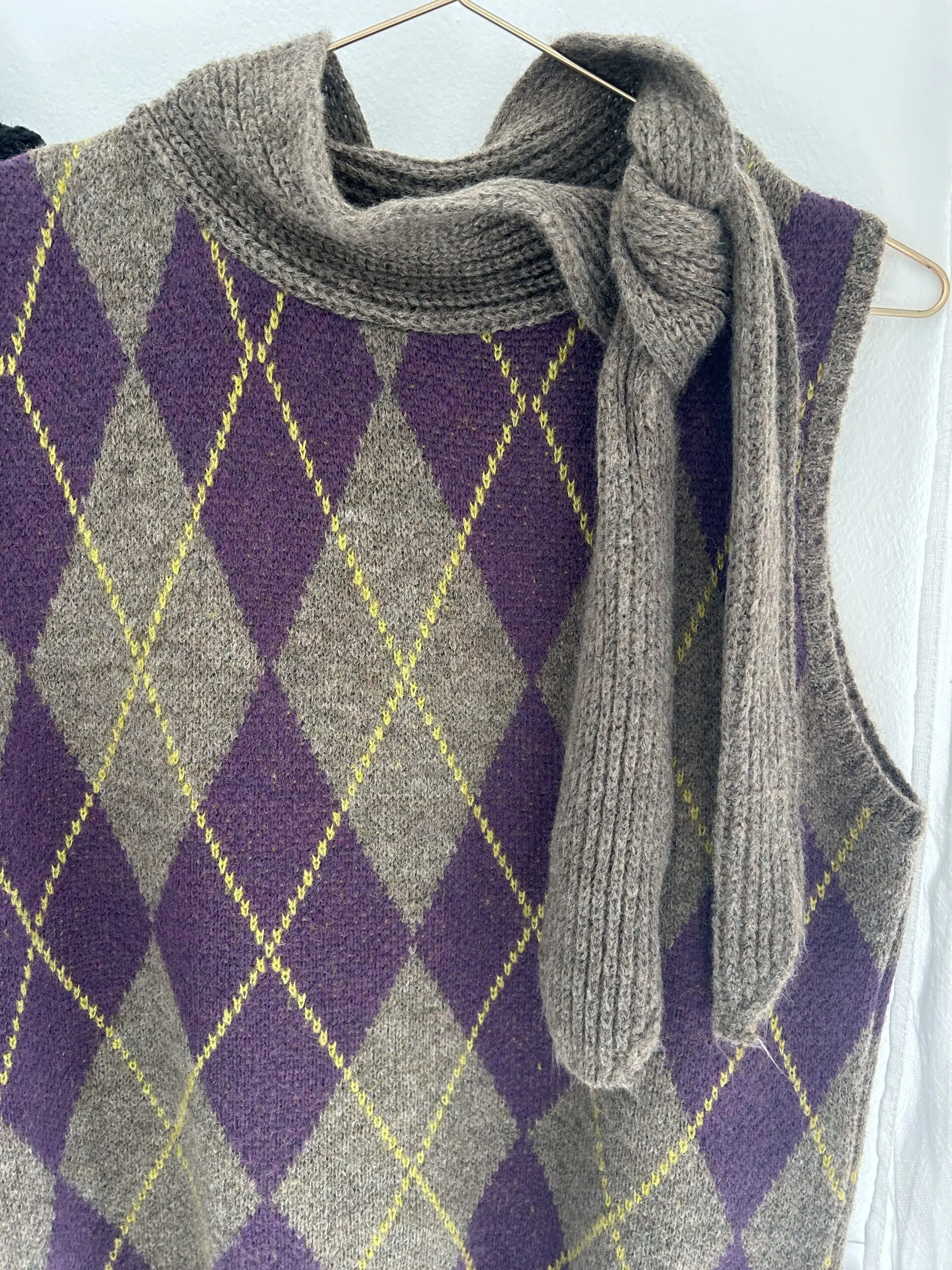 Chaleco de punto con estampado de rombos en tonalidades marrón y lilas con línea amarilla. Es de cuello redondo con detalle de lazo de punto como el chaleco.