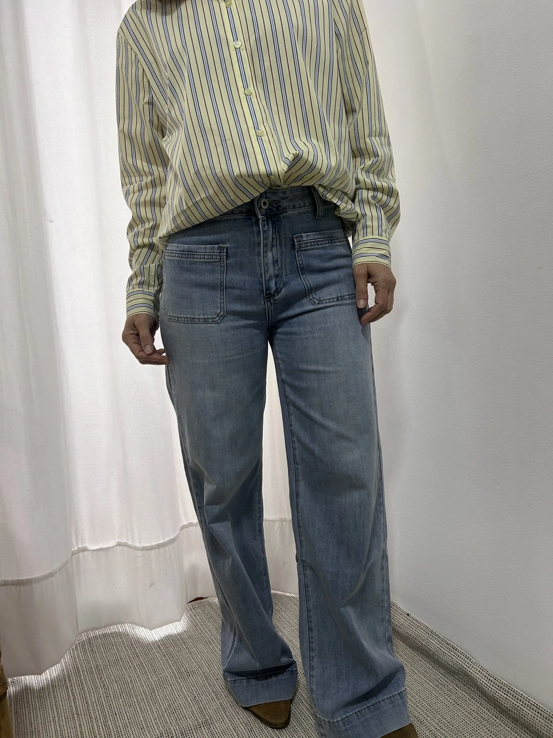 Pantalón de pernera amplia con corte ajustado de cintura a cadera y corte holgado de muslo a bajo. Cintura de talle medio con cierre de cremallera y botón. Bolsillos parche delante y detrás. Pantalón de diseño largo con bajo.