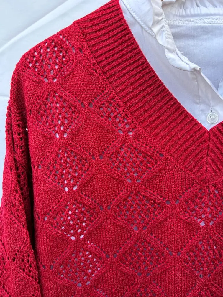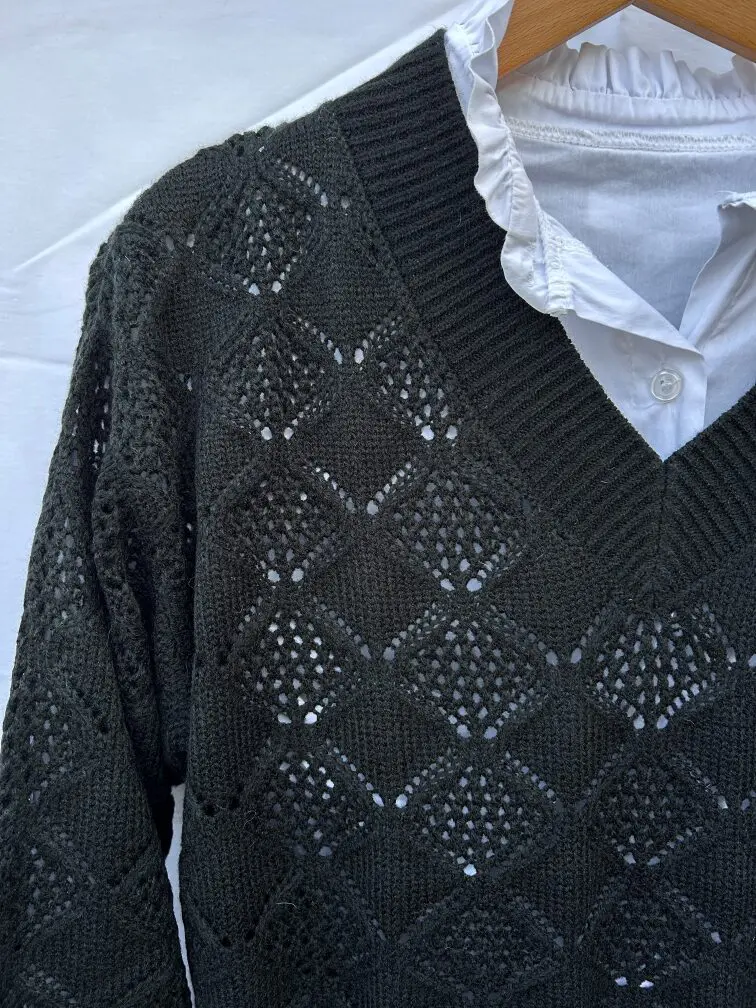 Jersey de punto calado y escote en pico. Terminación en canalé en manga y cintura. de estructura ancha, en la manga tiene detalle de 3 botones. Es un jersey elegante y bonito. Tiene un tacto muy agradable.