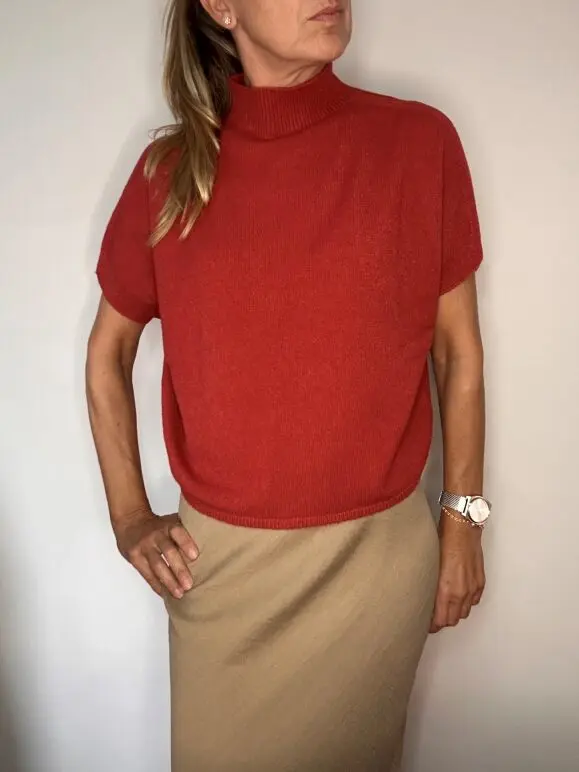 Jersey de punto de manga corta ancha y cuello medio. Terminación en canalé en cuello, manga y cintura. de estructura ancha, no es entallado y la manga es con caida de hombro, sin apretar. Es un jersey elegante y bonito. Tiene un tacto muy agradable.