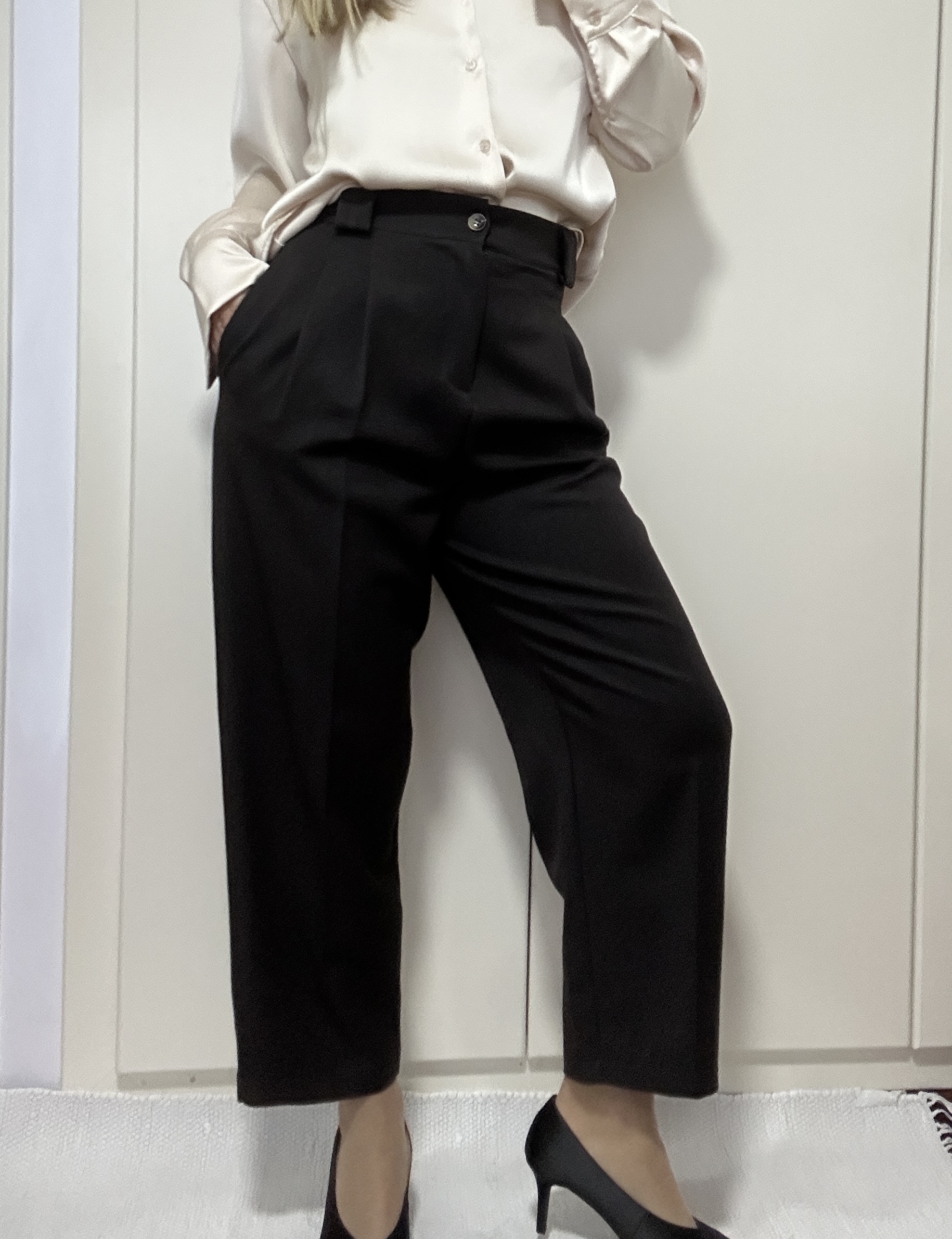 Pantalón de cintura media/alta con pinzas delanteras. Cierre con botón y cremallera, con trabillas para cinturón. Pernera ancha.