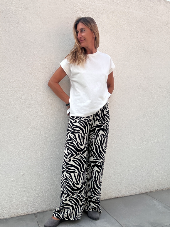 Pantalón recto de tejido fluido. De cintura elástica y detalle de lazo. Proporciona comodidad y libertad de movimiento.